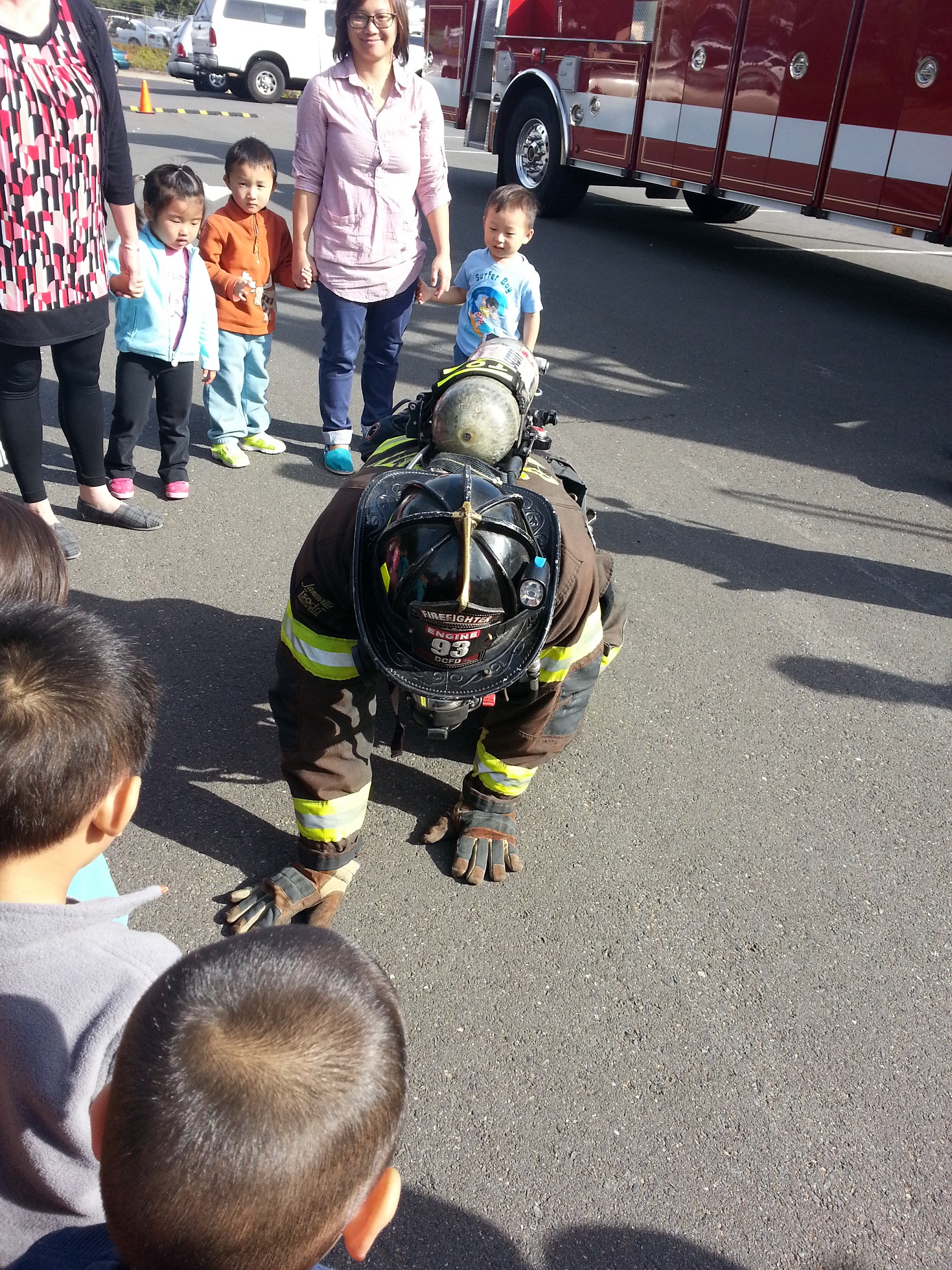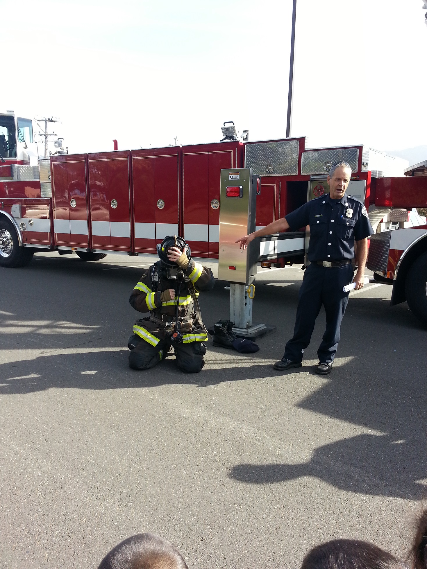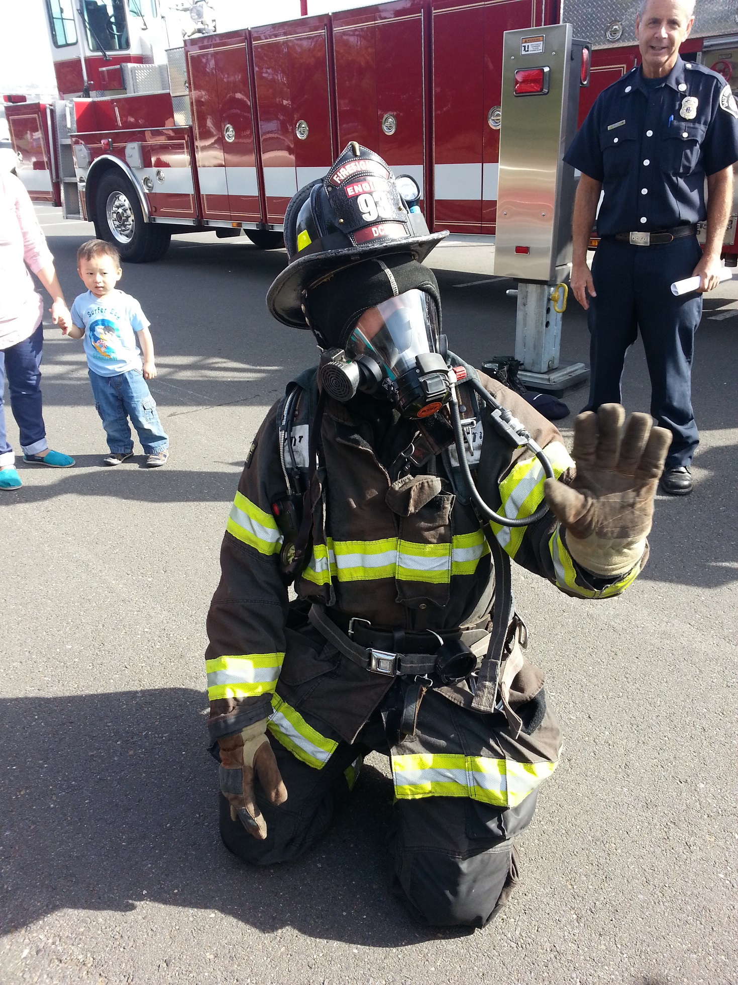 之後消防叔叔示範著晒所有裝備。同埋扮入火場~
